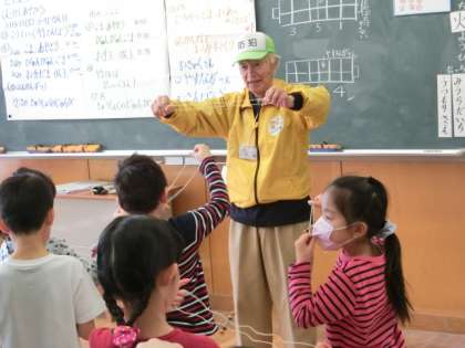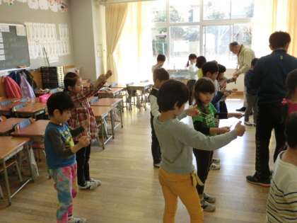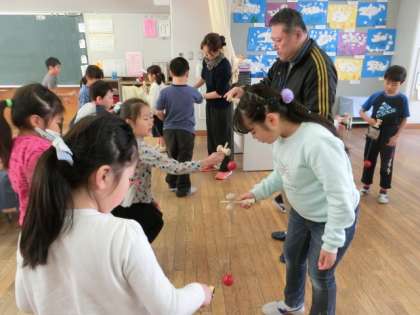 後半の4時間目は、教室に戻って、お手玉やけん玉、コマ回しなどの室内でできる遊びを教えてもらいました。ぶんぶんゴマなど、手先を上手に使って行う遊びには悪戦苦闘していたようですが、地域の方に上手にコツを教わって楽しむことができました。さまざまな遊びの材料など、いつも事前準備していただきありがとうございます。子どもたちもみんなご満悦の表情で、とても楽しい2時間になりました。