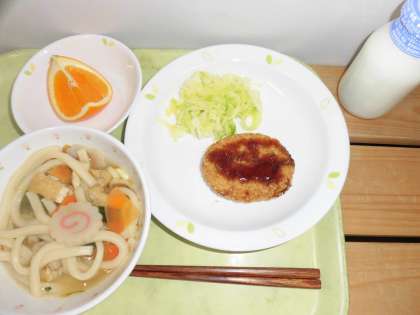 「煮込みうどん、おからコロッケ、茹でキャベツ、清見タンゴール、牛乳」です。
