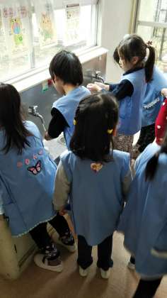 八幡山幼稚園では、お別れ会を行いました。1年間お世話になった年長組さんに、年少組さんが豚汁を作ったり、プレゼントを渡したりします。