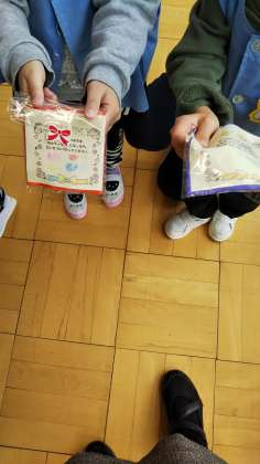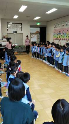 年少組さんのプレゼントのお返しに年長組さんからも、歌とプレゼントがありました。さすが、年長さんは、きちんと整列して大きな声で歌ってくれました。プレゼントは、年長さんになって使う「お弁当包み」でした。年長組さんありがとうございました。
