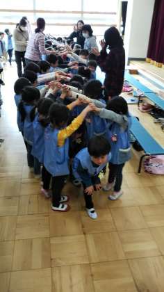 お別れ会の第1部の終了です。年少組さんが、アーチを作ってお見送りしてくれました