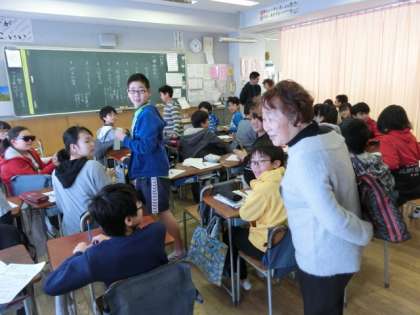 2時間目、外国語活動をしている6年生の教室に、懐かしい来校者が授業を参観しました。彼らが低学年のときにお世話になった、前副校長先生の原先生が訪ねて来てくださいました。突然の訪問に子どもたちは驚きながらも、とても嬉しそうな笑顔です。懐かしいお話もしていただき、楽しい授業になりました。