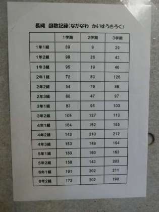 先日の体育朝会で行った長縄チャレンジの結果が掲示されました。今回も6年生をおさえて、4年2組が212回で1位となりました。6年1組との差はわずか1回でした。よくがんばりました。