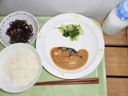「ごはん、鯖のごまだれかけ、蕪のレモン醤油、ひじきの煮付け、牛乳」です。