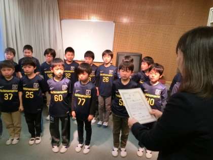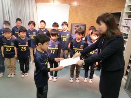 今日の朝会では、表彰が2件ありました。サッカーで活躍した2年生の選手たちと、日本語検定で優秀な賞を獲得した3年生児童です。いつもと違った雰囲気での表彰でしたが、立派な態度で賞状を受け取ることができました。