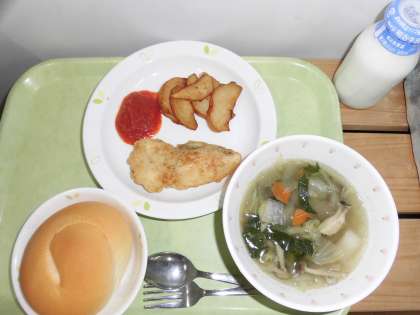 「ミルクパン、フィッシュ&チップス、手作りトマトケチャップ、鶏肉と白菜の生姜スープ、牛乳」です。
