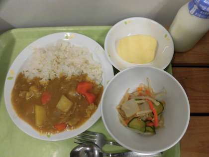 「カレーライス、こんにゃくサラダ、りんご、牛乳」です。