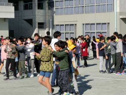 今年度最後の児童集会は、青空の下、校庭で行われました。全校児童で『ジャンケン列車』で楽しみます。いろいろな学年が混ざっての活動で、子どもたちも笑顔があふれます。