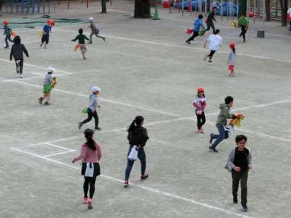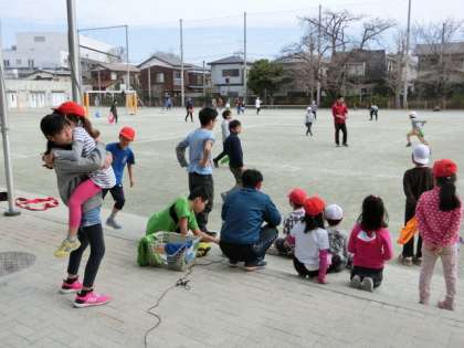1時間目、6年1組と1年2組での、ペア学年合同のお楽しみ会が、校庭で行われていました。卒業を目の前にした6年生に、今年1年たくさんお世話になった1年生。しっぽ取りで校庭を走り回り、とても楽しい1時間になりました。6年生も卒業前に、素敵な思い出の1ページになったようです。