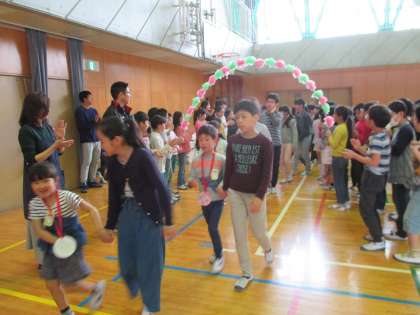 児童会のお兄さんお姉さんによる、くす玉割りや学校紹介に続き、先生紹介クイズでは全校が盛り上がりました。