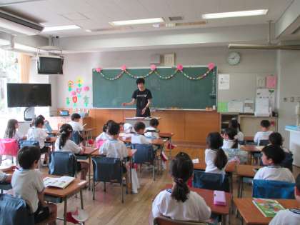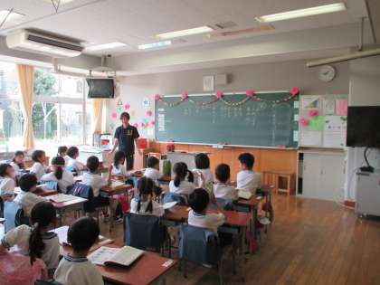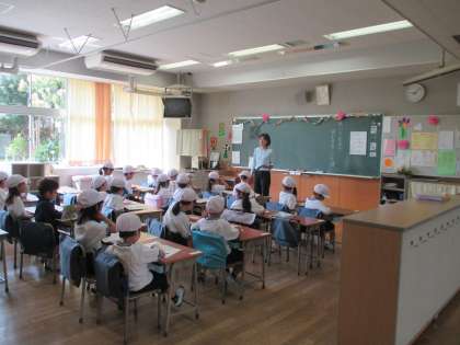 1年生の教室では、国語の授業が行われていました。各クラスとも、平仮名の学習です。お話を聞く姿勢も立派です。張り切って学習に取り組んでいました。