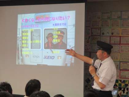 6年生は、京王電鉄の職員の方によるキャリア教育を行いました。どうやったら電車の運転手さんになれるのか、電車のお話だけでなく鉄道会社の仕事やグループ会社のことなど、京王電鉄と一口に言ってもいろいろなお仕事があることを教えていただきました。6年生が、将来何になりたいかという視点でもお話をしてくださいました。