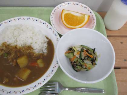 「給食番長のカレーライス、ひじきサラダ、甘夏みかん、牛乳」です。