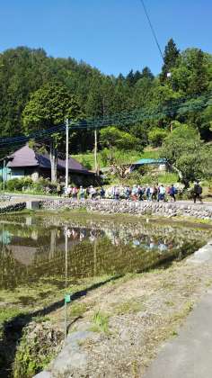 村巡りに出発しました。田植えが、終わったばかりの田んぼや蔵、蔵に付いた大きな蜂の巣を見ながら歩きました。