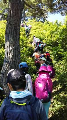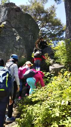 「愛宕山は神聖な山です静かに登りましょう。」と畑の真ん中の小さな山を登りました。最後は、岩をつかんで登りました。