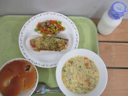 「ぶどうパン、鮭のガーリック焼き、野菜とコーンのソテー、卵とトマトのスープ、牛乳」です。