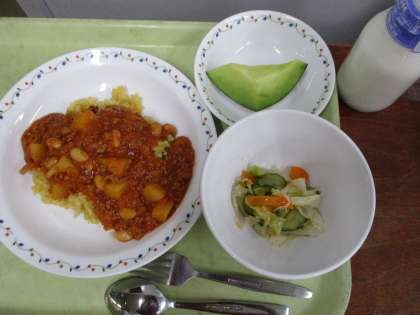 「チリビーンズライス、イタリアンサラダ、メロン、牛乳」です。