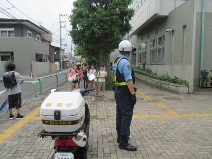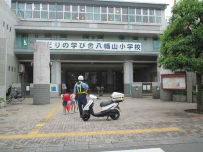 八幡山駐在所のお巡りさんや保護者の方・わんわんパトロールの方の見守りがあります。正門で校長先生と朝の挨拶をして子どもたちは登校しています。