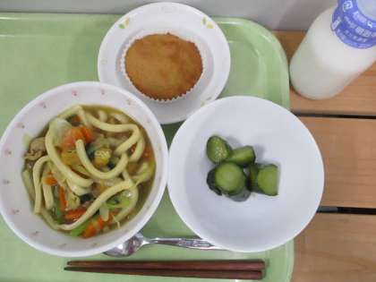 「うどんドンドコのカレーうどん、きゅうりの中華味、米粉ときな粉のマフィン、牛乳」です。