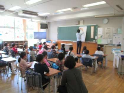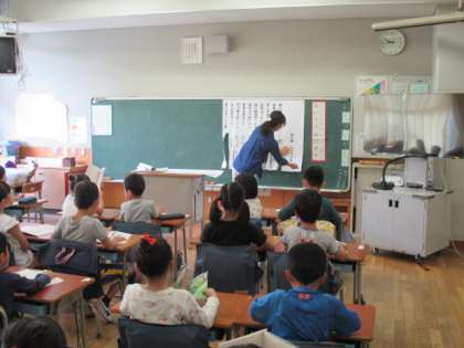 1年生の教室では、国語のねじめ正一さん作の「あいうえおにぎり」の授業が行われていました。子どもたちは「あいうえおにぎり」の文を全部暗記しています。子どもたちの大好きな学習です。