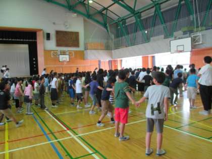 今日の児童集会は、「言うこと一緒やること一緒・言うこと反対やること反対」集会でした。集会委員の号令に従って、「前・後ろ・右・左」と言いながら動きます。スピードアップすると思わず間違えてしまいます。