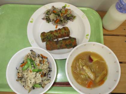 「五目ごはん、竹輪の磯辺揚げ、野菜のゆかりかけ、味噌汁、牛乳」です。