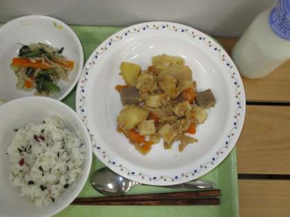 「梅わかごはん、じゃが芋のそぼろ煮、野菜のごまだれかけ、牛乳」です。
