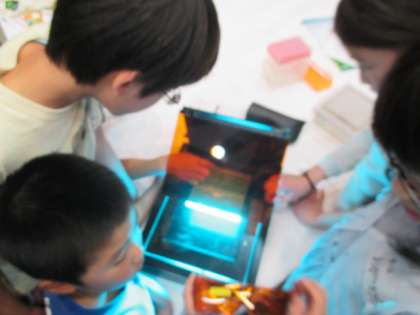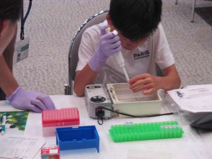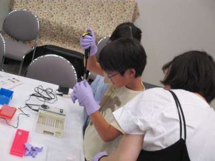 説明を聞いて、いよいよDNAの実験です。手袋をして、本物の研究者のようです。上手く結果が出せたかな?