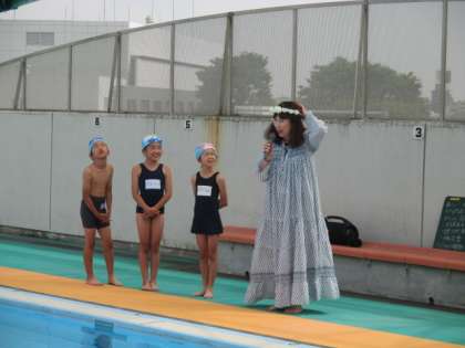 三年生のプール開きが行われました。今日は、なんと「プールの精」が登場!子ども達はプールの女神様に出逢いびっくり!歓声!!大喜びしました。3年生は、今年からは中学年の仲間入り。水泳の授業も低学年とは違ってレベルアップします。みんな、しっかり女神様のお話を聞き、プールに向かって各自の目標と安全を願いました。
