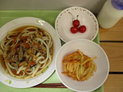 「五目冷やしうどん、かき揚げ、さくらんぼ、牛乳」です。