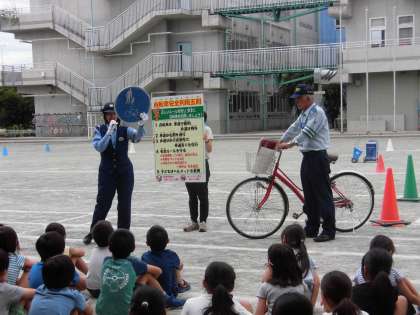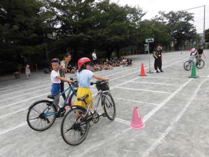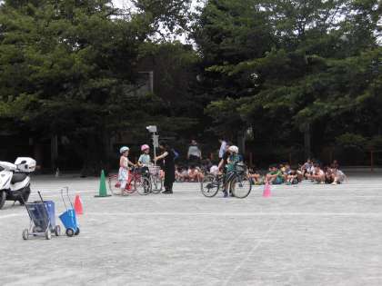 3年生の交通安全教室は、自転車の操作の仕方・安全な乗り方の実技でした。ご家庭の協力を得て貸していただいた自転車で、実際に校庭で体験をしました。小学生の自転車での事故は、毎年増えています。交通事故の被害者にも、加害者にもならないようにルールを守って乗りましょうね。
