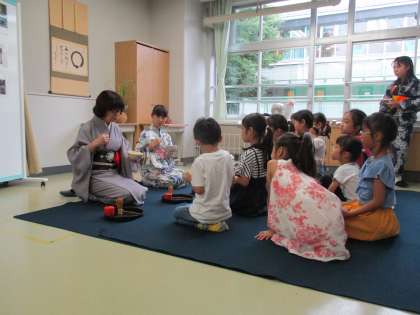 毎年好評の茶道も、緑丘中学校の茶道部の中学生のお手伝いがあり、低学年も高学年も熱心に取り組んでいました。低学年の講座では、保護者の方の見学も多く、日本文化に触れる良い機会となりました。