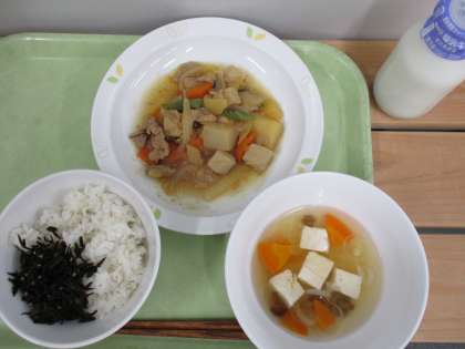 「麦ごはん、ひじきのふりかけ、肉じゃが旨煮、豆腐汁、牛乳」です。