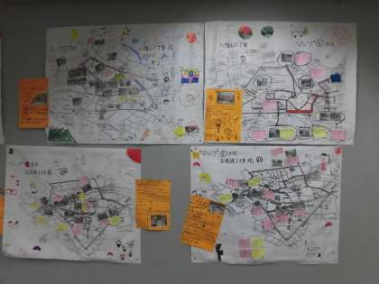 2階の中央ろうかに、4年生の交通安全マップがけい示されています。学校周辺の安全マップをグループの子と協力しながら作成しました。