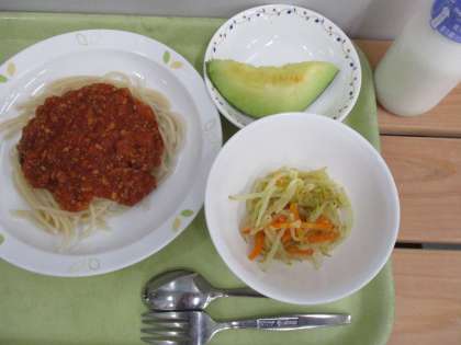 「スパゲティミートソース、インディアンサラダ、メロン、牛乳」です。