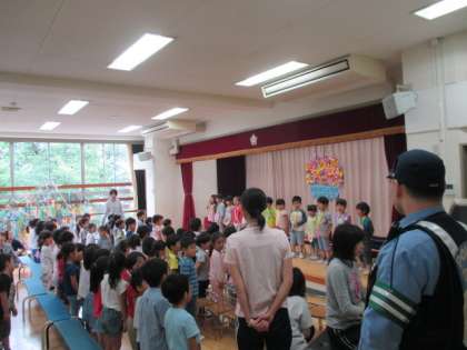今日は、特別ゲストに八幡山駐在所のお巡りさんの武藤さんが来てくれ、夏休みの注意事項をお話してくれました。