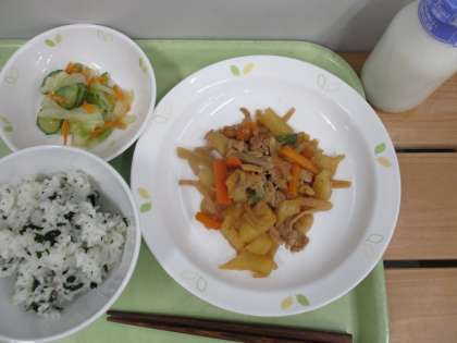 「わかめごはん、金平煮、和風サラダ、牛乳」です。