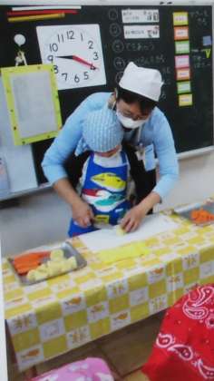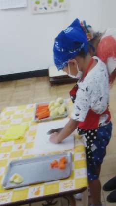 まずは、年長組さんの野菜の調理です。お手伝いの保護者の方に教えてもらいながら、じゃがいもとにんじんを切りました。包丁で上手に切れましたね。
