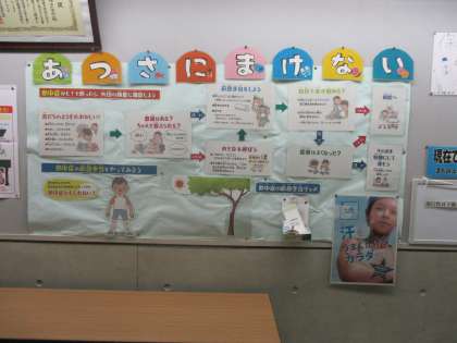 本校の保健室は、児童の靴箱の近くにあります。その保健室の掲示板には、毎月様々なテーマの掲示物が掲示されています。