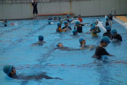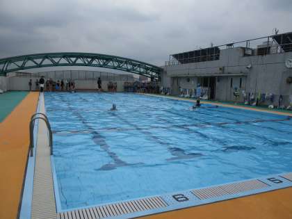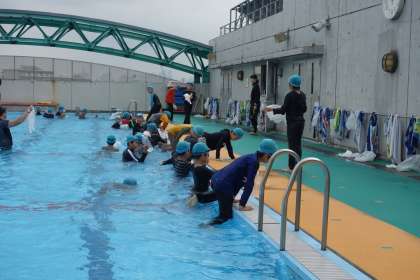 1、2校時目に、着衣水泳を行いました。服を着たまま泳いだり、水から上がったりしました。水着の時だけとは違う、重みを感じました。
