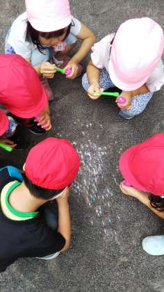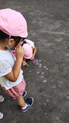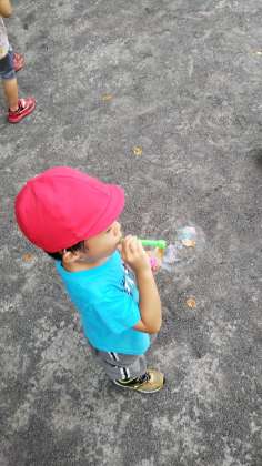 年少組さんのシャボン玉遊びが始まりました。湿気が多いので、地面に落ちたシャボン玉が割れずにいます。子どもたちの発想は凄いですね。