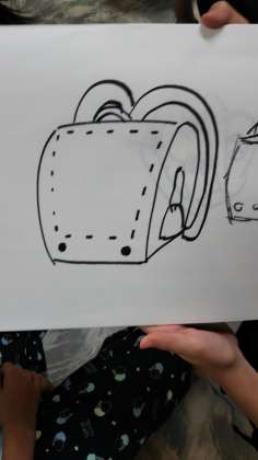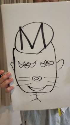 ランドセルを描いた子どもチームとマリオを描いた先生チームの作品です。