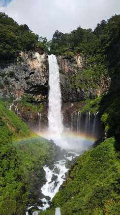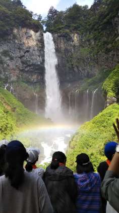 華厳の滝の見学です。エレベーターで展望台まで100メートル降りました。降りるとひんやりしました。ちょうど朝日が当たり、華厳の滝に虹がかかっていました。なかなか出来ない経験でした。