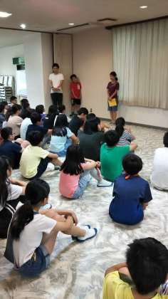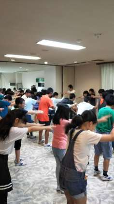 3日目の朝会です。小雨のため、ホールで行いました。子どもたちは、皆元気です。「最後の1日頑張りましょう」と児童代表の言葉がありました。最後の体操はエビカニクスでした。今日も頑張りましょう。