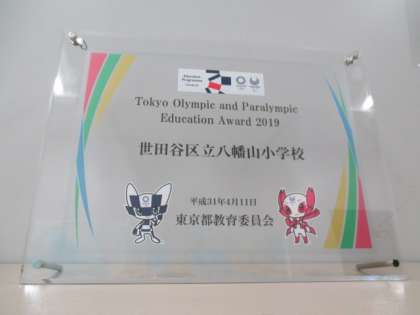 八幡山小学校は、「東京オリンピック・パラリンピックアワード校2019」に選ばれました。今年で3年連続の快挙です。今年は、表彰状に加えてマスコットの「ミライトワ」と「ソメイティ」の付いた楯も届きました。いよいよ「東京2020大会」の1年前となりました。子どもたちとともに、更に盛り上げていきたいと思います。