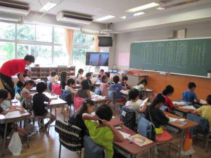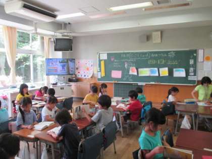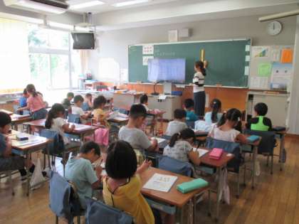 1組は、算数の10より大きい数を。2組は、国語の読書感想文を。3組は、図工の夏休みの思い出を絵に表わしていました。2学期もよい学習のスタートがきれて落ち着いて授業に取り組んでいました。