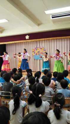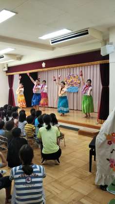 今日のお誕生会の出し物は、幼稚園の卒園生のお母さんたちによるフラダンスでした。綺麗な衣装と踊りに、子どもたちは目をキラキラさせて楽しんでいました。