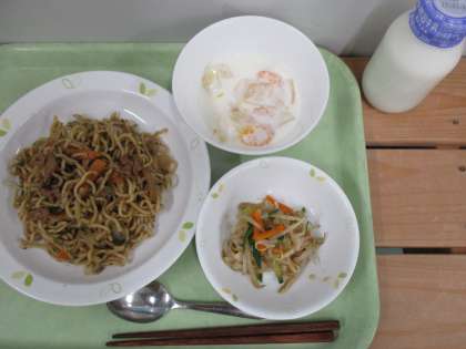 「ソース焼きそば、もやしのコチュジャンかけ、フルーツヨーグルト、牛乳」です。