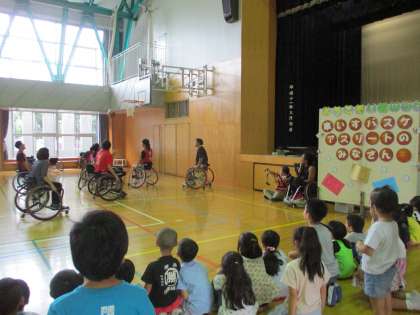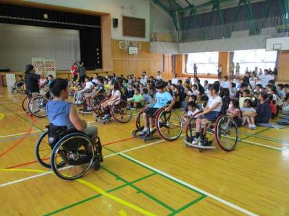 障がいを持つ方の生活やスポーツについてお話いただいたり、競技用車いすの試乗をさせていただいたりなど、とても貴重な体験をさせていただきました。車いすバスケットボールの迫力や、滅多にできない体験に、子どもたちは興味津々でした。