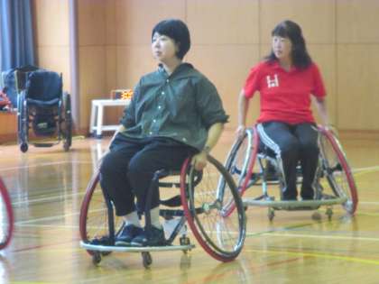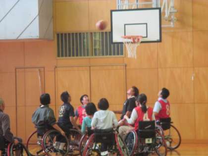 子どもたちの体験の前に、選手の方と保護者・先生・BOPの先生たちで車いすバスケの試合が行われました。子どもたちの応援で、先生たちもシュートが決まりました。